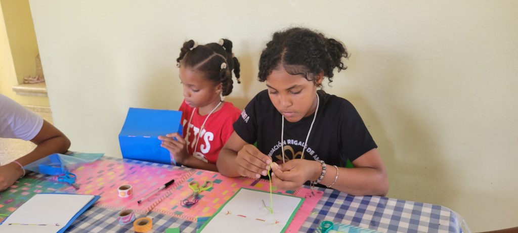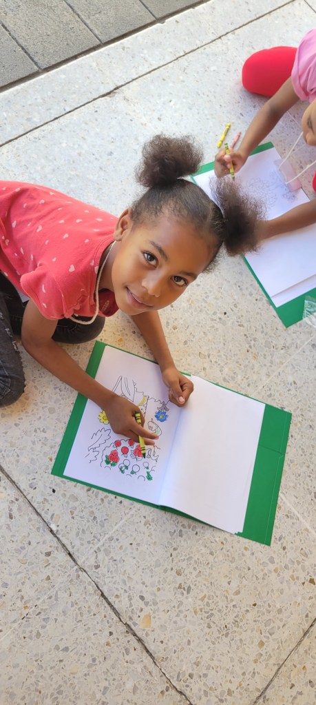 Our days start with a daily ritual when we sing songs and read the reading of the day. At the time, the leader reviews the basics of the story – who were the characters? What happened? etc. In the reflection station, Jeane guides age-appropriate reflection. They may talk about “What does this story mean to me?” or ” How does it relate to me today?” Over the years, we’ve learnedthate girls are more open to sharing their thoughts while they color.