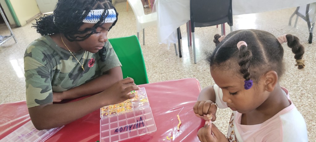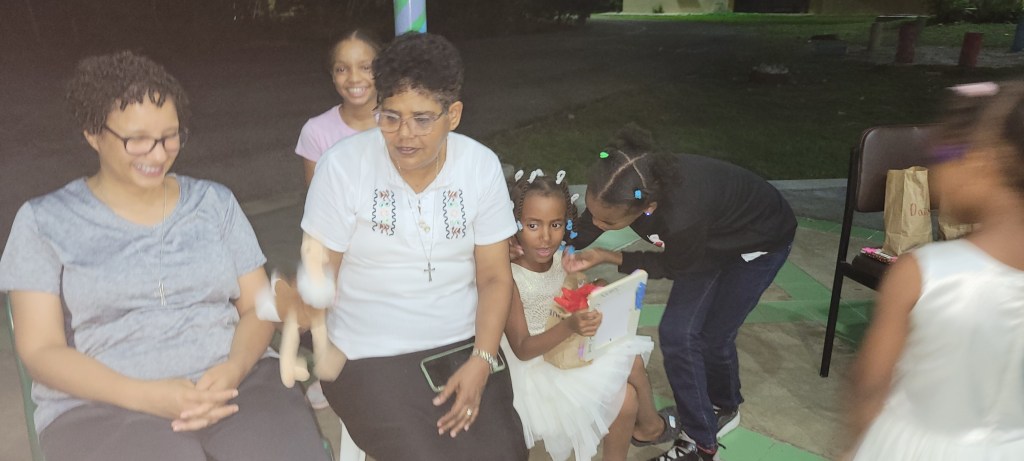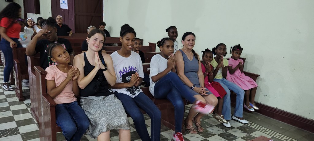 Circle time then shifted to Mary and Martha, inviting everyone to consider the tension between action and contemplation—how to balance service with prayer, busyness with stillness—an especially relevant theme for a week of intense activity. With one day of experience, both the travelers and the girls moved through the stations more confidently, and the Sisters’ kitchen team elevated the day with a beautifully prepared meal of fresh‑caught bacalao, black beans and rice, and Dominican coleslaw, nourishing body and spirit alike.